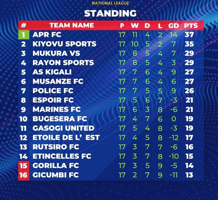 Umunsi wa 17 wa Shampiyona usize Gicumbi FC yo mu Karere ka Gicumbi mu Ntara y’Amajyaruguru ku mwanya wa nyuma, mu gihe APR FC n’ubwo yatsinzwe na Musanze FC, ikomeje kuyobora urutonde n’amanota 37, ikaba irusha amanota 2 Kiyovu Sports iyigwa mu ntege.