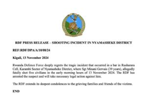 Yagize ati: “Ingabo z’u Rwanda (RDF) zibabajwe n’ibyago byabereye mu kabari ko mu Kagari ka Rusharara, Umurenge wa Karambi mu Karere ka Nyamasheke, aho Sgt Minani Gervais w’imyaka 39 akekwaho kurasa abantu batanu akabahitana mu rukerera rwo ku wa 13 Ugushyingo 2024.”