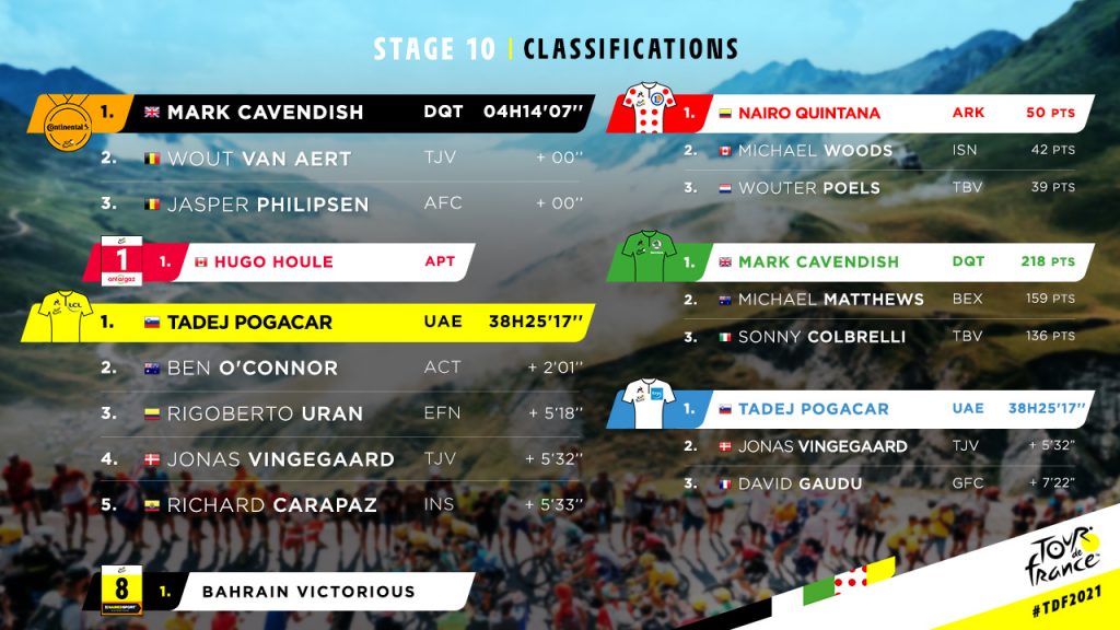 Umunya-Slovenia Tadej Pogacar utaje mu 10 ba mbere muri aka gace ka 10 aracyambaye umwambaro w’umuhondo kuko ayoboye urutonde rw’abamaze gukoresha igihe gito (38H25’18’’), agakurikirwa na Ben O’Connor arusha igihe kingana n’iminota 2 n’isegonda rimwe (2’01’’), mu gihe ku mwanya wa 3 haza umunya-Colombia Rigoberto Uran urushwa n’uwambere iminota 5 n’amasegonda 18.