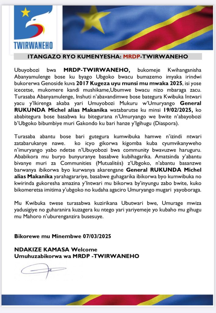 Ubu ni ubutumwa bukubiye mu itangazo uyu mutwe wa Twirwaneho washyize ahagaragara ku wa Gatanu tariki 07 Werurwe 2025, rishyirwaho umukono na Ndakize Welcome Kamasa. Rigira riti: “Ubuyobozi bwa MRDP-TWIRWANEHO, bukomeje kwihanganisha Abanyamulenge bose ku byago ubwoko bwacu bumazemo imyaka irindwi bukorerwa Jenoside kuva 2017 kugeza ubu.”
