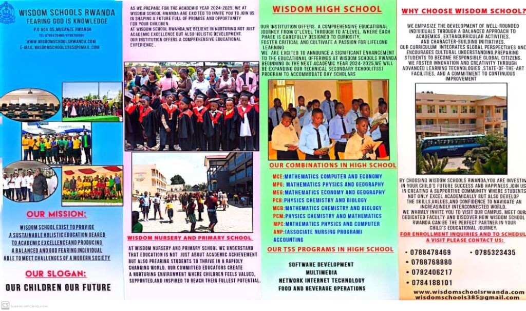 Kwandika abanyeshuri bashya biri gukorerwa ku mashami ya Wisdom Schools mu gihugu hose, ukaba wanahamagara cyangwa ukandikira mwalimu Nduwayesu Elie kuri: +250 788 478 469 ku bindi bisobanuro.