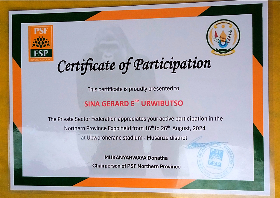 Umuhangamirimo Dr. Sina Gerard wamamaye binyuze muri Entreprise Urwibutso ifite icyicaro kuri Nyirangarama, benshi bakaba banamuzi ku izina rya Nyirangarama mu karere ka Rulindo, akomeje guhabwa ibikombe bitandukanye abikesha imikorere myiza inoze ndetse no guhanga udushya kuko mu byo akora byose ngo aharanira ko buri gihe yaba afite akantu kadasanzwe (agashya).