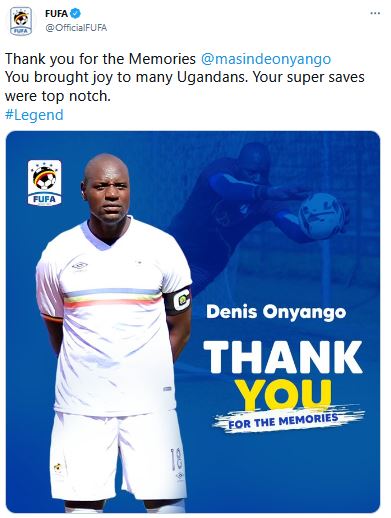 Ishyirahamwe ry’umupira w’amaguru mu gihugu cya Uganda naryo ribinyujije ku rukuta rwaryo rwa Twitter ryashimiye uyu mugabo bagiranye ibihe byiza. Riti: “Warakoze cyane guhagararira igihugu cyawe neza. Usize urwibutso rutazibagirana mu mitima y’abakunzi ba Uganda Craines kandi ntituzibagirwa kenshi wagiye urokora ibitego byabazwe”.