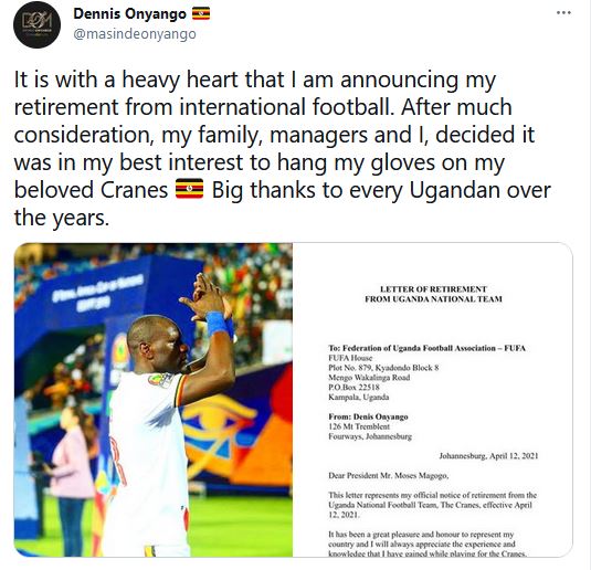 Nyuma y’imyaka 15 yose ahagararira igihugu cye mu marushanwa atandukanye imisambi ya Uganda yagiye yitabira, umunyabigwi Dennis Onyango yasezeye muri iyi kipe bikora ku mitima ya benshi mu bakunzi, abakinnyi ndetse n’abayobozi b’iyi kipe y’igihugu.
