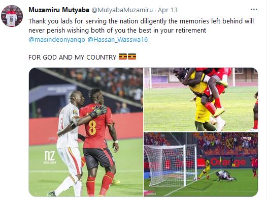 Muzamiru Mutyaba bakinanye muri Uganda Craines ubu akaba akinira Express yayize ati: “Warakoze ntwari, umuyobozi ndetse ukaba n’icyitegererezo kuri twebwe abatoya twagusanze muri iyi kipe y’igihugu. Ibikorwa byawe ntibizibagirana. Tukwifurije ibyiza aho uri no mu bindi bikorwa by’umupira w’amaguru nyuma yo gusezera muri iyi kipe y’igihugu cyacu“.